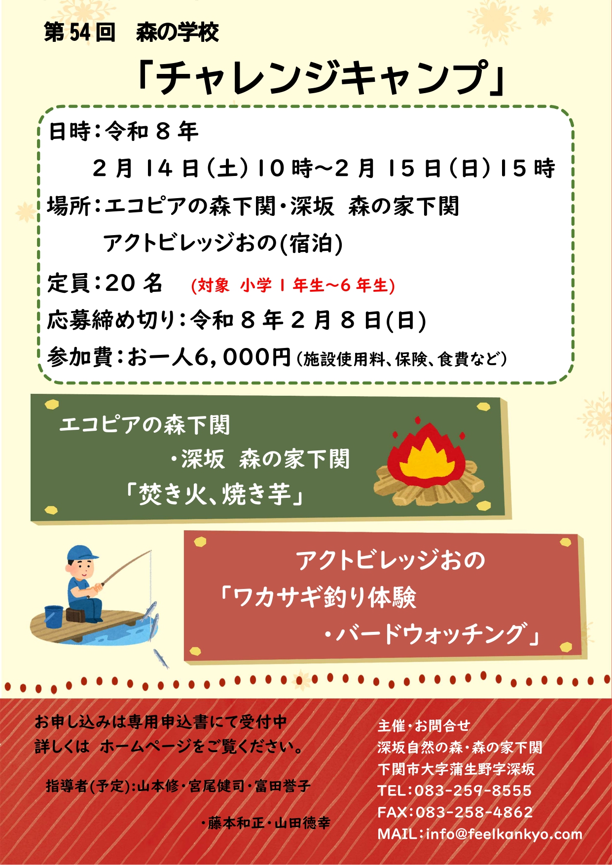 お知らせ 2026年(令和8年)2月14日(土)~15日(日)第54回森の学校「チャレンジキャンプ」 令和8年2月14日(土)~15日(日)に第54回 森の学校「チャレンジキャンプ」を開催します応募締め切り2月8日(日)・募集要項・開催概要・申込用紙 Excel PDF TOPICS一覧へ 電話・問い合わせをする